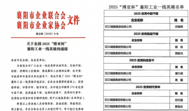 近日,从襄阳市企业联合会传来喜讯,在2025“博亚杯”襄阳工业一线英雄评选活动中,u乐国际城建9名干部职工凭借突出表现,