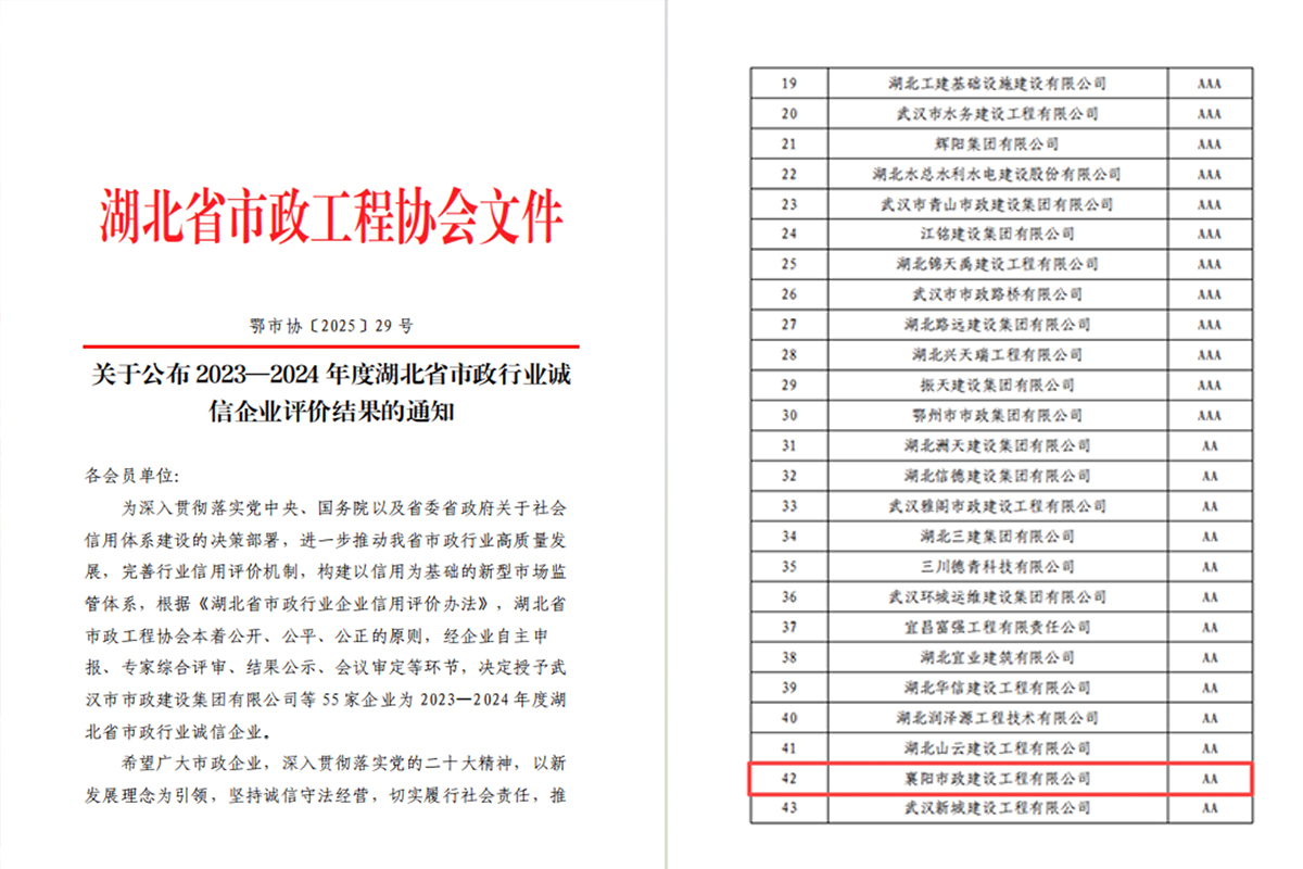12月29日,湖北省市政工程协会发布《关于公布2023—2024年度湖北省市政行业诚信企业评价结果的通知》(鄂市协〔2025〕29号),u乐国际城建子公司市政公司凭借规范的经营管理、扎实的履约能力和良好的社会责任口碑,获评“湖北省市政行业AA级诚信企业”。
